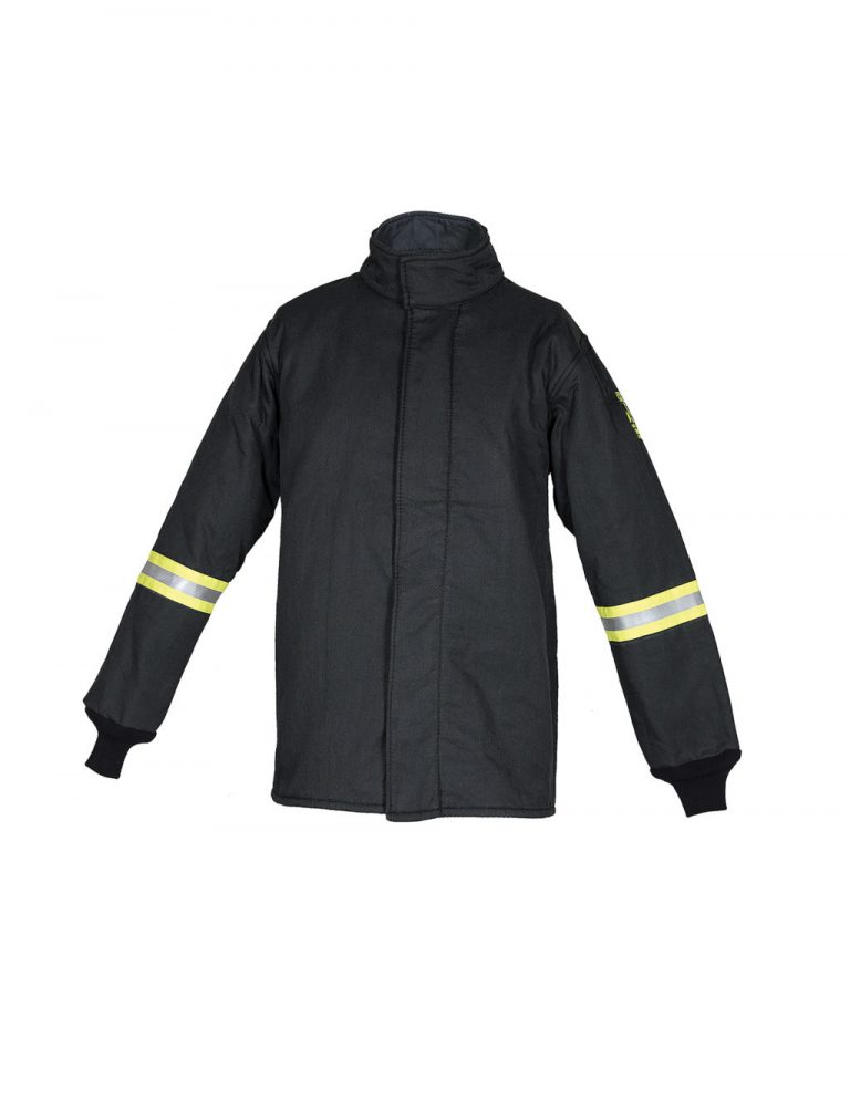 Todos los materiales utilizados en la fabricación de estas prendas, incluido el hilo, son inherentemente resistentes al fuego. La chaqueta y la jardinera tienen puños y cierres frontales de seguridad hecho con Velcro® y Nomex® con cremallera FR.